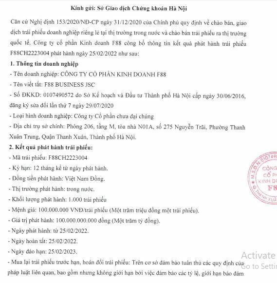 Theo thông tin từ Sở giao dịch Chứng khoán Hà Nội (HNX), CTCP Kinh doanh F88 vừa hoàn tất phát hành 100 tỷ đồng trái phiếu.