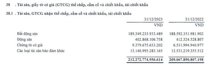Mặt khác, theo báo cáo tài chính hợp nhất kiểm toán năm 2023 tại VietABank, tính đến cuối năm 2023, tài sản, giấy tờ có giá nhận thế chấp, cầm cố và chiết khấu, tái chiết khấu của khách hàng tăng nhẹ 2% so với đầu năm, đạt hơn 212.272 tỷ đồng. Trong đó, 89% tài sản thế chấp là bất động sản, đạt hơn 189.349 tỷ đồng, lớn hơn cả tổng dư nợ cho vay khách hàng (cho vay khách hàng chỉ hơn 69.000 tỷ đồng).