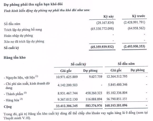 Trong kỳ Công ty thực hiện trích lập dự phòng phải thu ngắn hạn khó đòi 65,4 tỷ đồng (đầu năm chỉ 29 triệu đồng); trích lập 0,58 tỷ đồng giảm giá tồn kho so với đầu năm không phải trích lập.