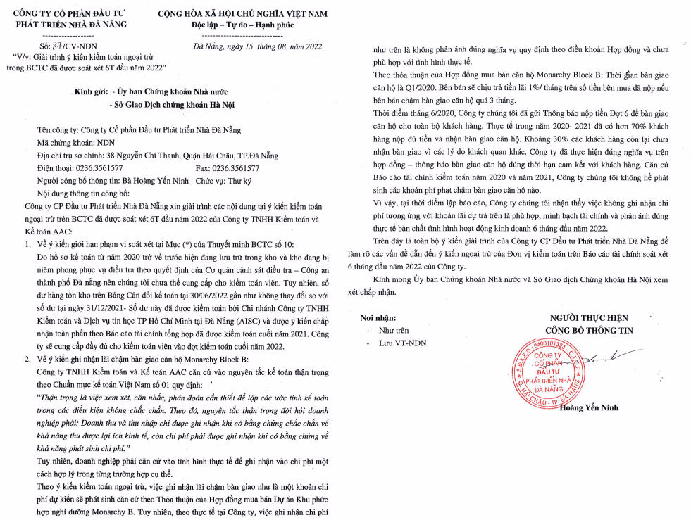 Giải trình về vấn đề này, Nhà Đà Nẵng cho biết việc ghi nhận lãi chậm bàn giao như là một khoản chi phí dự kiến sẽ phát sinh căn cứ theo Thoả thuận của Hợp đồng mua bán Dự án Khu phức hợp nghỉ dưỡng Monarchy B. Tuy nhiên, theo thực tế tại công ty, việc ghi nhận chi phí như trên là không phản ánh đúng nghĩa vụ quy định theo điều khoản Hợp đồng và chưa phù hợp với tình hình thực tế.