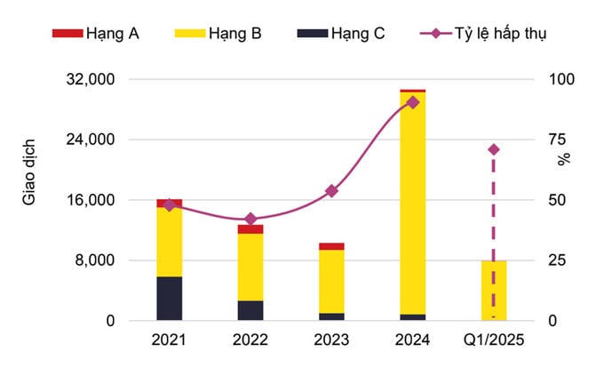 Trong năm 2025, nguồn cung mới dự kiến gồm 7.400 căn hộ, trong đó hạng B tiếp tục dẫn đầu, chiếm 67%. Từ năm 2026 trở đi, khoảng 80.900 căn hộ từ 99 dự án sẽ được mở bán, với Hoài Đức, Đông Anh và Hoàng Mai đóng góp 52% thị phần.