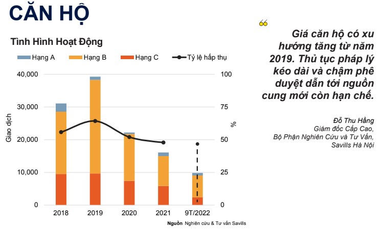 Theo bà Đỗ Thu Hằng, Giám đốc cao cấp, Bộ phận nghiên cứu và tư vấn Savills Hà Nội, giá căn hộ có xu hướng tăng từ năm 2019. Thủ tục pháp lý kéo dài và chậm phê duyệt dẫn tới nguồn cung còn hạn chế.