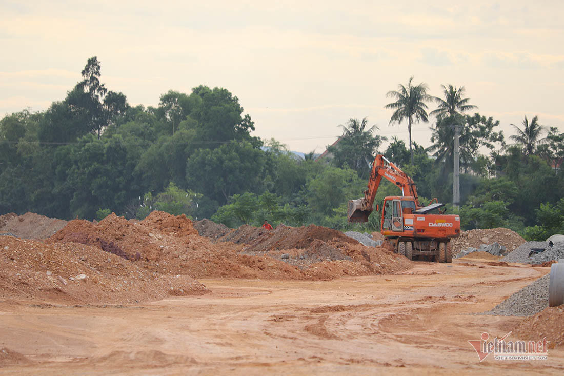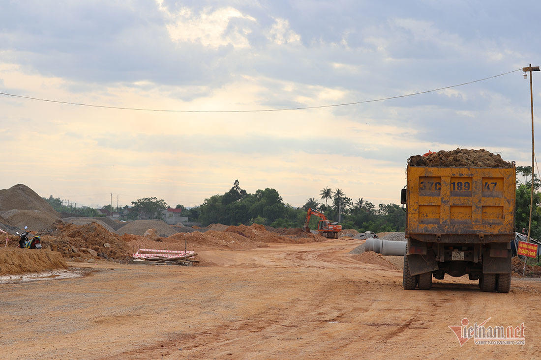 Tại công trường, nhiều xe ô tô tải chở đất san lấp mặt bằng thường xuyên ra vào, bên trong vẫn đang ngổn ngang đất đá, vật liệu xây dựng.