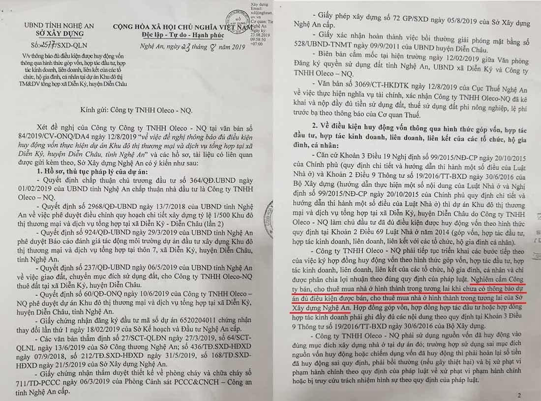 Ngày 23/8, Sở Xây dựng Nghệ An có văn bản số 2577/SXD-QLN thông báo việc công ty Oleco đủ điều kiện được huy động vốn thông qua hình thức góp vốn, hợp tác đầu tư, hợp tác kinh doanh, liên doanh, liên kết của các tổ chức, hộ gia đình, cá nhân.