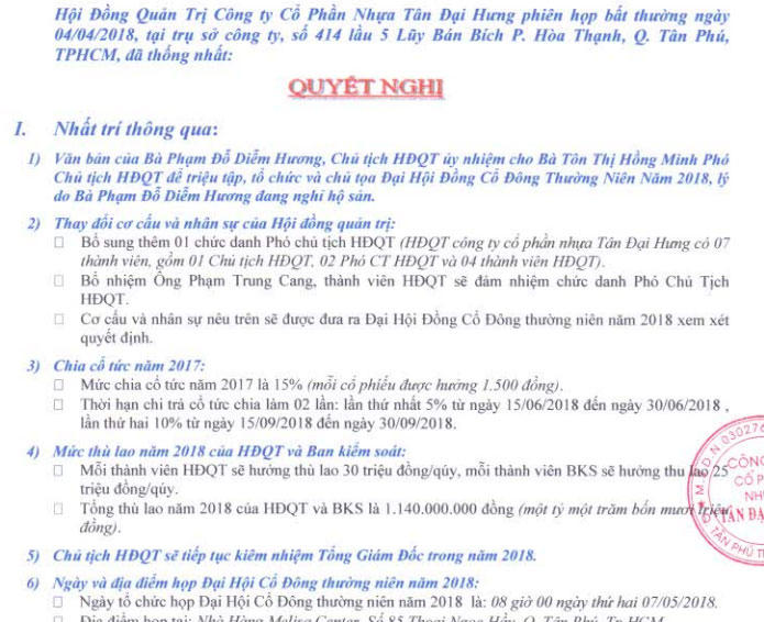 Hội đồng quản trị (HĐQT) CTCP Nhựa Tân Đại Hưng (TPC) vừa có nghị quyết bất thường triệu tập đại hội đồng cổ đông thường niên 2018. Trong đó, một nội dung quan trọng là bổ sung thêm một chức danh Phó chủ tịch HĐQT.