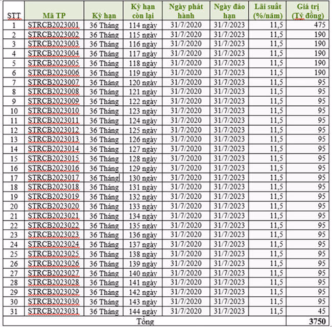 Ngoài 20 lô trái phiếu này, Setra Corp hiện còn lưu hành 31 lô trái phiếu khác (từ STRCB2023001 đến STRCB2023031) với tổng giá trị 3.750 tỷ đồng. Các lô trái phiếu này được phát hành vào ngày 31/7/2020, đáo hạn vào ngày 31/7/2023 và đều do Công ty cổ phần Chứng khoán Kỹ Thương làm tổ chức lưu ký, đều có lãi suất là 11,5%/năm.
