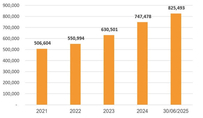 Tính đến 30/6/2025, tổng tài sản của SHB đạt gần 825 nghìn tỷ đồng, trong đó, dư nợ cho vay khách hàng vượt 594,5 nghìn tỷ đồng, tăng 14,4% so với đầu năm và tăng mạnh 28,9% so với cùng kỳ.