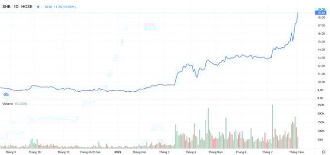 Trên thị trường chứng khoán, phiên 4/8, vốn hóa SHB chạm mốc 3 tỷ USD, thị giá gấp đôi so với đầu năm, hiện giao dịch quanh mức 18.600 đồng/cổ phiếu. SHB ghi nhận nhiều phiên giao dịch trên 100 triệu cổ phiếu, dẫn đầu nhóm VN30 và ngành ngân hàng. Đặc biệt, ngày 7/7, SHB có phiên giao dịch kỷ lục gần 250 triệu cổ phiếu. SHB cũng là mã cổ phiếu nhận được sự thu hút của khối ngoại với khối lượng mua ròng hơn 100 triệu đơn vị trong tháng 7 vừa qua.