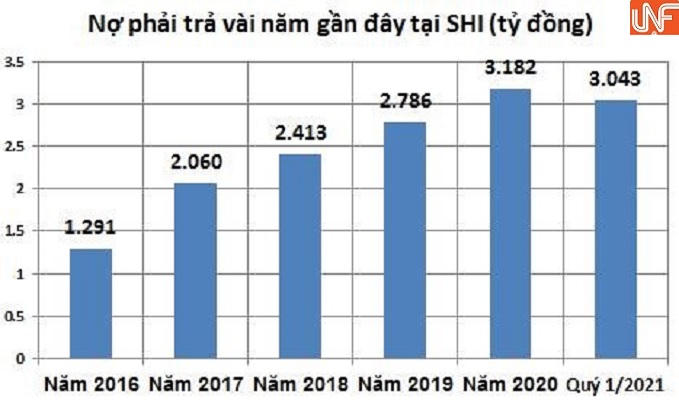 Trước đó, nợ phải trả của SHI đã tăng từ 1.291 tỷ đồng (2016) lên 3.182 tỷ đồng (năm 2020). Hệ số nợ phải trả/vốn chủ sở hữu trong giai đoạn 2016-2020 lần lượt là: 1,5 lần (năm 2016), 2,2 lần (năm 2017), 2,1 lần (2019) và 2,4 lần (2020).