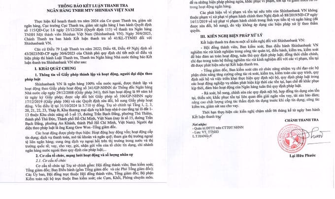Thanh tra Ngân hàng Nhà nước (NHNN) mới đây đã ban hành kết luận thanh tra đối với Ngân hàng TNHH MTV Shinhan Việt Nam(Shinhan Bank Việt Nam), chỉ ra nhiều vi phạm