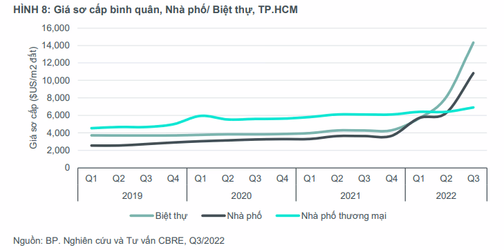 Báo cáo thị trường quý 3/2022 của CBRE Việt Nam, giá bán nhà phố thương mại tại TP.HCM tính từ năm 2019 luôn trong xu hướng tăng.