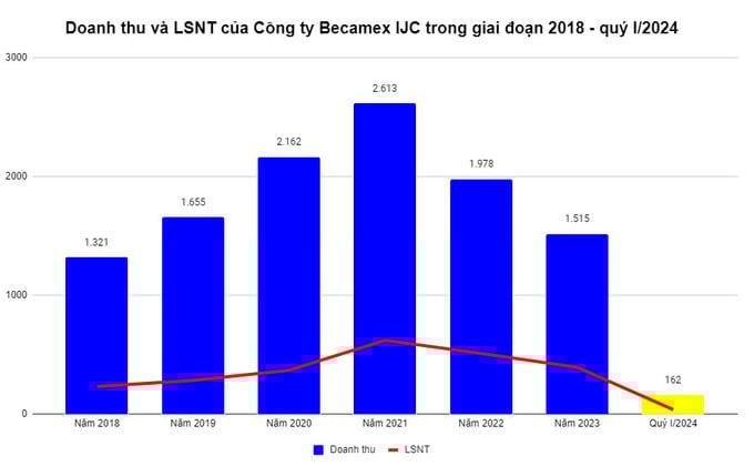 Kết thúc quý I/2024, Công ty Becamex IJC ghi nhận doanh thu thuần đạt 162 tỷ đồng, giảm 52% so với cùng kỳ năm trước; lợi nhuận gộp giảm 53%, xuống còn 81 tỷ đồng.