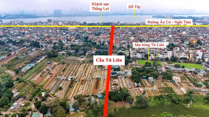 Tại phía quận Tây Hồ, đường nối với khu vực cầu Tứ Liên hiện là khu dân cư và vùng trồng đào quất. Phía Đông Anh đoạn cầu và đường dẫn đi dọc theo sông Ngũ Huyện Khê, phần đất canh tác và đi qua một số tuyến đường như: Đường Trường Sa, đường quốc lộ 3…