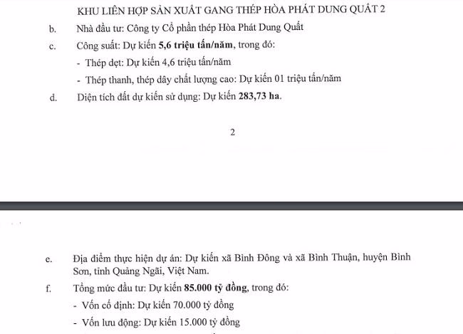 Được biết, Khu liên hợp sản xuất gang thép Hoà Phát Dung Quất 2 có vị trí tại xã Bình Đông và xã Bình Thuận, huyện Bình Sơn, tỉnh Quảng Ngãi. Mức vốn dự kiến của dự án khoảng 85.000 tỷ đồng. Theo thông tin từ phía Hòa Phát trong đó, vốn cố định 70.000 tỷ đồng, vốn lưu động 15.000 tỷ đồng.