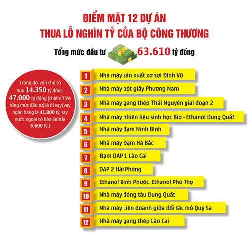 - Hàng chục nghìn tỷ vốn vay ngân hàng “chôn” vào các dự án ngàn tỷ thua lỗ, đắp chiếu, kém hiệu quả của ngành Công Thương chưa biết bao giờ thu hồi hết được. Trong khi đó, lãnh đạo các dự án ngàn tỷ này liên tục xin cơ cấu lại nợ, giảm lãi vay.