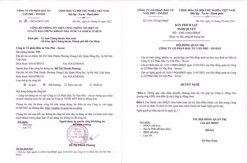 Mới đây Công ty Cổ phần Đầu tư Văn Phú – Invest (VPI) đã công bố thông tin về việc nhận chuyển nhượng toàn bộ vốn góp tại Công ty TNHH MTV Đầu tư Hùng Sơn (tương ứng 100% vốn điều lệ của công ty Hùng Sơn). Theo đó, dự án Khu biệt thự Hùng Sơn – Nam Sầm Sơn, thành phố Sầm Sơn, tỉnh Thanh Hóa do Công ty Hùng Sơn làm chủ đầu tư sẽ chính thức “về tay” VPI.