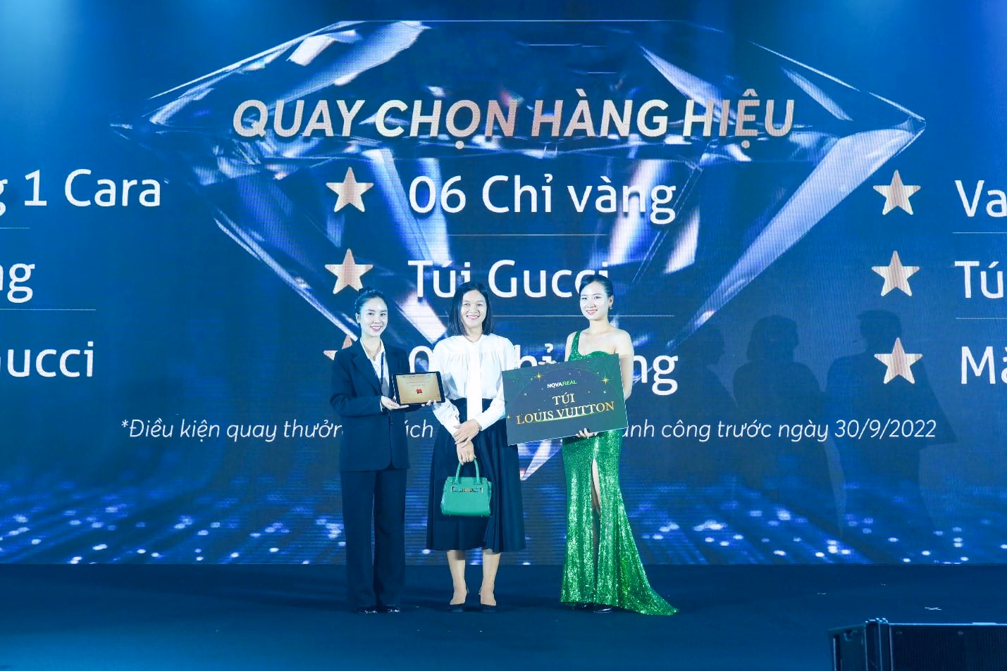 Sự kiện cũng đã tìm ra những khách hàng may mắn của Chương trình “Vòng quay may mắn” với những quà tặng có tổng giá trị lên tới hàng tỷ đồng gồm kim cương 1 Cara; túi xách, vali, mắt kính đến từ các thương hiệu danh tiếng Louis Vuitton, Gucci, Chanel; quà tặng từ 3 - 6 lên tới 9 chỉ vàng.