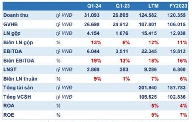Theo Báo cáo tài chính hợp nhất quý I/2024, doanh thu hợp nhất của CTCP Tập đoàn Hòa Phát (mã cổ phiếu HPG) đạt 31.093 tỷ đồng, tăng 4.227 tỷ đồng, tương ứng tăng 16% so với quý I/2023 (26.865 tỷ đồng). Lợi nhuận sau thuế hợp nhất là 2.869 tỷđồng, tăng 2.486 tỷ đồng so với quý I/2023.