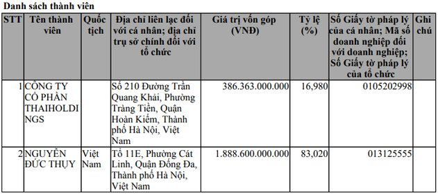 Theo thông tin đăng ký ban đầu, Thaispace có vốn điều lệ dự kiến 26.688 tỷ đồng trong đó Thaiholdings dự kiến góp vốn tổng cộng 1.334,4 tỷ đồng tương ứng 5% tổng vốn điều lệ của Thaispace; Bầu Thuỵ góp 75% vốn tương ứng 20.016 tỷ đồng; con gái bầu Thuỵ - bà Nguyễn Ngọc Mỹ Anh - góp 2.669 tỷ đồng tương ứng 10% vốn điều lệ và con trai bầu Thuỵ là ông Nguyễn Xuân Thái góp 10% vốn điều lệ. Bà Nguyễn Ngọc Mỹ Anh là CEO kiêm người đại diện theo pháp luật của Thaispace