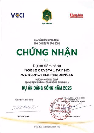 Chính sách trên tạo cơ hội hiếm có để các nhà đầu tư có thể sở hữu dòng sản phẩm Sky Mansions, nơi giá trị vừa nằm ở vị trí, vừa ở cách con người trải nghiệm không gian sống của chính mình.Nội dungNội dungNoble Crystal Tay Ho WorldHotels Residences vừa được vinh danh ở hạng mục "Dự án tiềm năng" tại Lễ trao chứng nhận "Dự án Đáng sống" 2025. Buổi lễ diễn ra ngày 25/12 tại Hà Nội, do Tạp chí Diễn đàn Doanh nghiệp tổ chức dưới sự chỉ đạo của Liên đoàn Thương mại và Công nghiệp Việt Nam (VCCI). Chương trình bình chọn "Dự án đáng sống" là một trong những giải thưởng thường niên uy tín hàng đầu của ngành bất động sản Việt Nam. Hệ thống tiêu chí đánh giá liên tục được cập nhật theo khung pháp lý mới, tập trung vào chất lượng sống, tính bền vững, trải nghiệm cư dân và đóng góp tích cực cho cộng đồng.