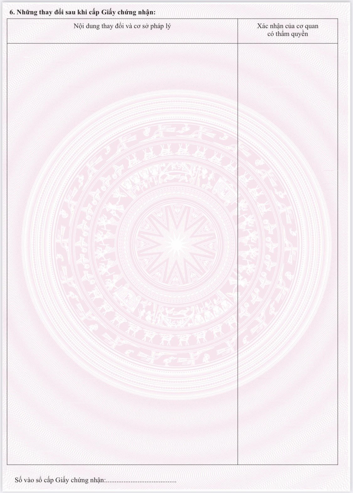Trang 2 của giấy chứng nhận gồm các nội dung: mục "6. Những thay đổi sau khi cấp Giấy chứng nhận"; số vào sổ cấp giấy chứng nhận.