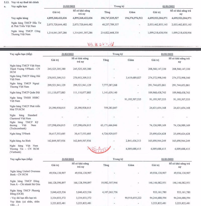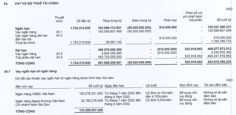 Trong đó, các khoản vay ngắn hạn từ ngân hàng ở mức 133 tỷ đồng đến từ Ngân hàng HSBC Việt Nam (với 100,2 tỷ đồng) và Ngân hàng Ngoại thương Việt Nam (Vietcombank) với 32,8 tỷ đồng. Các khoản vay này đều không có tài sản đảm bảo.