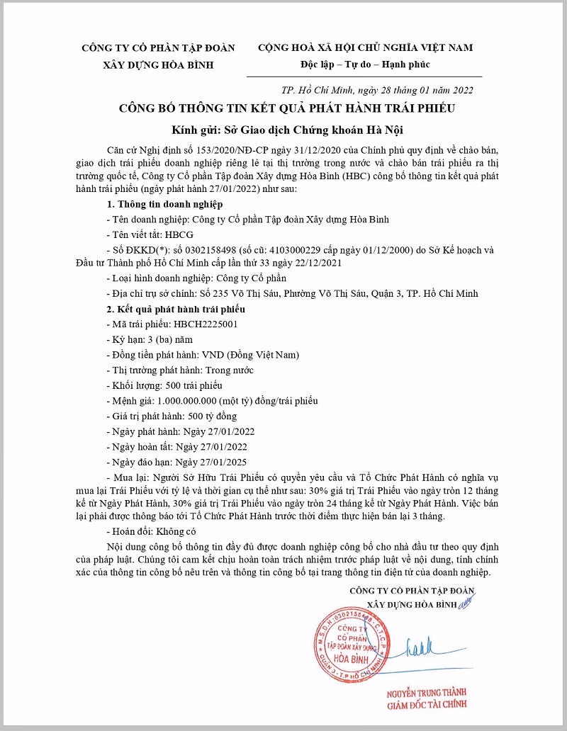 Về tình hình phát hành trái phiếu doanh nghiệp, cho đến nay Hòa Bình đã có hai lần phát hành trái phiếu để huy động vốn. Cụ thể, vào ngày 14/1/2022 Hòa Bình đã công bố chào bán 500 trái phiếu với kỳ hạn 5 năm, mệnh giá 1 tỷ đồng/trái phiếu, giá trị phát hành là 500 tỷ đồng.
