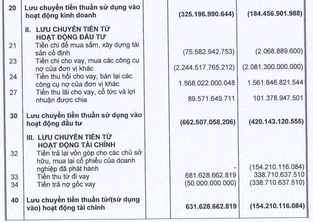 Trong kỳ, dòng tiền kinh doanh của Coteccons ghi nhận âm 325,2 tỷ đồng (cùng kỳ âm 184,5 tỷ đồng). Ngoài ra, dòng tiền đầu tư cũng âm 662,5 tỷ đồng và dòng tiền tài chính dương 631,6 tỷ đồng, chủ yếu tăng vay nợ.