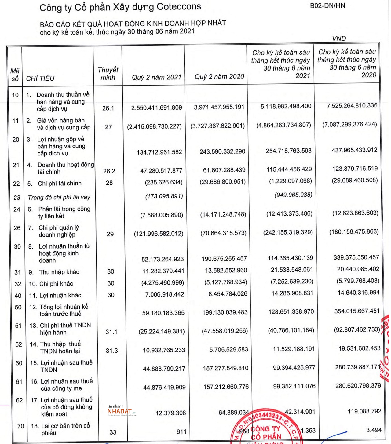 Thật vậy, theo kết quả tại BCTC hợp nhất quý II/2021 của Coteccons, kết thúc nửa năm 2021, Công ty mới chỉ thực hiện được 29,3% doanh thu và 29,1% về lợi nhuận sau thuế so với kế hoạch cả năm đề ra.
