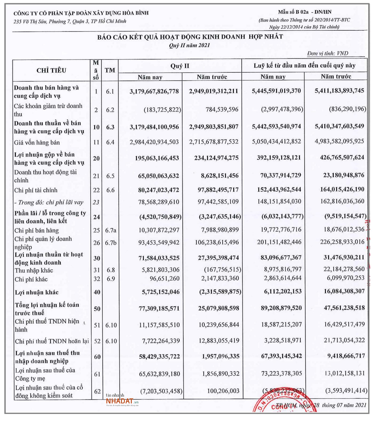 Theo BCTC hợp nhất quý II/2021 của Hòa Bình, doanh thu thuần của HBC đạt gần 3,180 tỷ đồng, tăng 8% so với cùng kỳ năm 2020. Lợi nhuận gộp của HBC trong quý 2 ghi nhận hơn 195 tỷ đồng, giảm 17%. Lợi nhuận sau thuế công ty 58 tỷ đồng