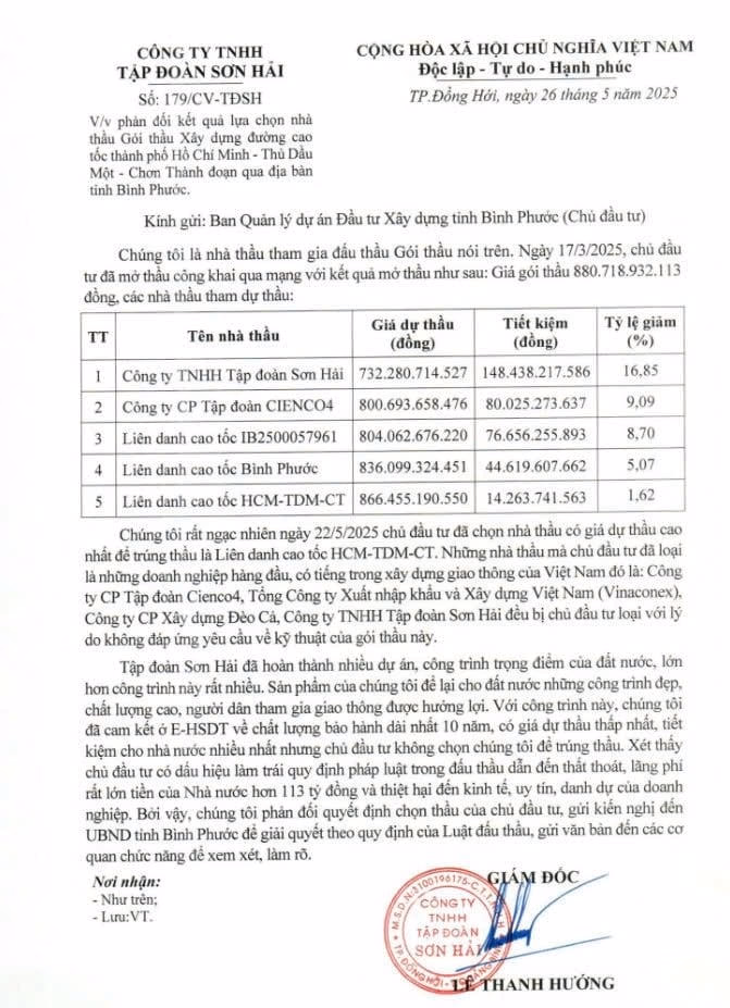 Ngày 26/5, Công ty TNHH Tập đoàn Sơn Hải đã có công văn gửi Ban Quản lý dự án Đầu tư Xây dựng tỉnh Bình Phước, phản đối kết quả lựa chọn nhà thầu gói thầu xây dựng tuyến cao tốc TP. HCM – Thủ Dầu Một – Chơn Thành, đoạn qua tỉnh Bình Phước.