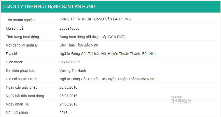 Theo tìm hiểu, doanh nghiệp được thành lập vào ngày 26/8/2016 với số vốn điều lệ ban đầu 20 tỷ đồng. Ngành nghề hoạt động chính là kinh doanh bất động sản. Địa chỉ công ty tại Khu nhà ở xã hội Lan Hưng, đường Kinh Dương Vương, thị trấn Hồ, huyện Thuận Thành, tỉnh Bắc Ninh.