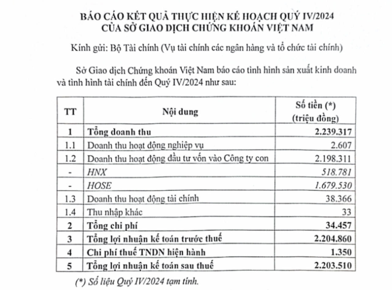 Hoạt động đầu tư vốn vào công ty con (HoSE và HNX) chiếm tới 98% tổng doanh thu với 2.198 tỷ đồng, tăng mạnh so với năm 2023. Trong đó, HoSE đóng góp xấp xỉ 1.680 tỷ đồng, còn HNX mang về 519 tỷ đồng.