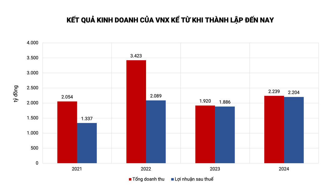 Ban đầu, VNX đặt mục tiêu lãi sau thuế hợp nhất 1.423 tỷ đồng. Tuy nhiên, nhờ tình hình kinh doanh khả quan, công ty đã hoàn thành 87% chỉ tiêu lợi nhuận chỉ sau nửa năm. Do đó, cuối năm 2024, VNX đã mạnh tay nâng chỉ tiêu lợi nhuận thêm 40% lên 1.987 tỷ đồng. So với mức này, kết quả thực tế vẫn vượt 11% kế hoạch. Đây cũng là khoản lãi lớn nhất của VNX kể từ khi thành lập đến nay.