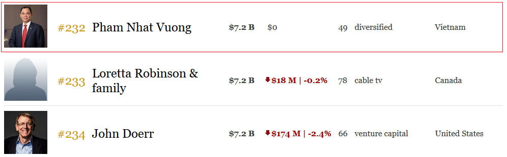 Theo cập nhật mới nhất từ tạp chí danh tiếng Forbes, tổng tài sản của tỷ phú Phạm Nhật Vượng hiện đã lên đến 7,2 tỷ USD, đưa ông Vượng lên vị trí giàu thứ 232 thế giới.