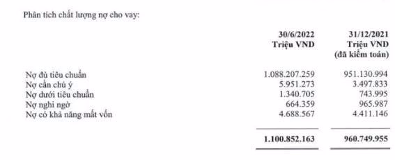 Tính đến 30/6/2022, tổng nợ xấu tại Vietcombank tăng 9% so với đầu năm, ghi nhận gần 6.694 tỷ đồng. Trong đó, nợ dưới tiêu chuẩn tăng mạnh nhất đến 80%, chiếm 1.340 tỷ đồng; nợ có khả năng mất vốn tăng nhẹ 6% lên hơn 4.699 tỷ đồng và nợ nghi ngờ giảm 31% xuống còn 664 tỷ đồng.