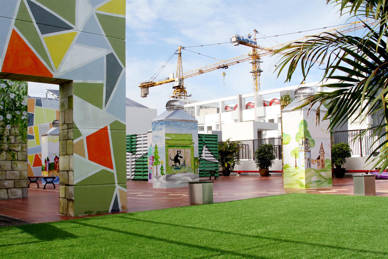 Cảnh quan vườn dạo và khu vui chơi trên tầng mái