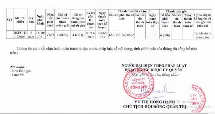 Lô trái phiếu có mã BSECH2126003 được phát hành ngày 15/10/2021 với kỳ hạn 5 năm. Ngày thanh toán theo kế hoạch là 30/6/2023. Số tiền gốc phải thanh toán là 4.800 tỷ đồng. Lãi và lãi phạt phải thanh toán là hơn 668 tỷ đồng. Doanh nghiệp này đã không thanh toán gốc và lãi trong kỳ.