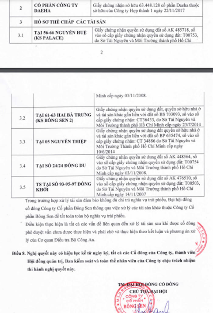 Đại hội này cũng thông qua việc xử lý tài sản của công ty để thực hiện nghĩa vụ trái phiếu doanh nghiệp đã phát hành. Các tài sản bao gồm phần góp vốn của bà Trần Thi Phơ; cổ phần Công ty Daeha; và hồ sơ thế chấp một loạt tài sản là bất động sản (tại 55-56 Nguyễn Huệ - Khách sạn Palace; 61-63 Hai Bà Trưng – khách sạn Bông Sen 2; số 5 Nguyễn Thiệp, 93-95-97 Đồng Khởi…)