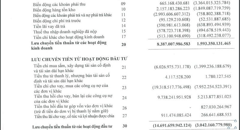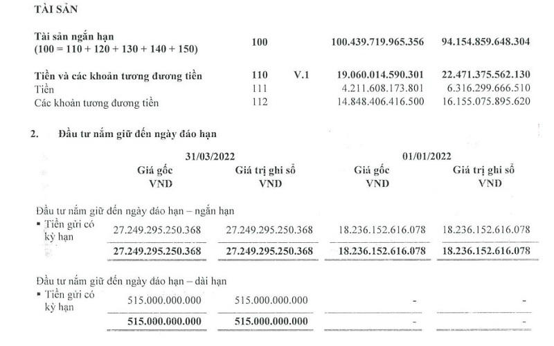 Trong đó, tiền và các khoản tương đương tiền là 19.060 tỷ đồng (giảm 15% so với đầu năm), tiền gửi ngắn hạn là 27.249,3 tỷ đồng và tiền gửi dài hạn tại ngân hàng là 515 tỷ đồng.