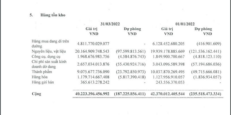Số dư hàng tồn kho tại ngày 31/12 là 40.223 tỉ đồng, chiếm 21,5% tổng tài sản, giảm 5% so với đầu năm. Trong đó một nửa lượng hàng tồn kho đến từ nguyên, vật liệu.