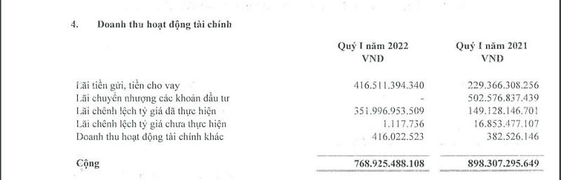 Doanh thu hoạt động tài chính của HPG đạt 768,9 tỉ đồng trong 3 tháng đầu năm 2022, giảm 14,4% so với cùng kỳ năm trước, chủ yếu là do không ghi nhận lãi chuyển nhượng các khoản đầu tư. Trong đó, lãi tiền gửi, tiền cho vay của HPG đạt 416,5 tỉ đồng, gấp 1,8 lần so với cùng kỳ năm trước.