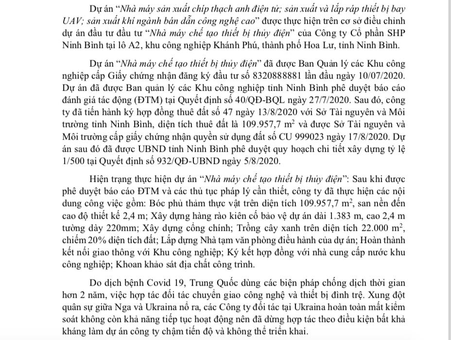 Trong danh sách công khai đề cập tới dự án Nhà máy chế tạo thiết bị thuỷ điện, quy mô 11ha và có tổng vốn đầu tư 450 tỷ đồng. Dự án này do Công ty cổ phần SHP Ninh Bình làm chủ đầu tư.