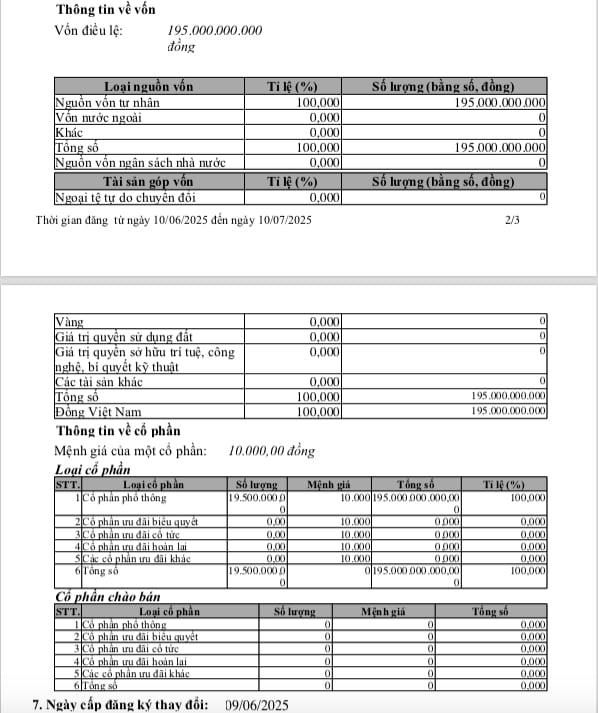 Cập nhật thay đổi thông tin gần nhất ngày 9/6/2025, công ty bất ngờ giảm vốn điều lệ xuống còn 195 tỷ đồng. Người đại diện theo pháp luật của công ty là Vương Thanh Tùng, chức vụ Tổng giám đốc.