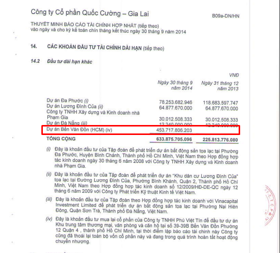 Tại Báo cáo tài chính quý III/2014 của Quốc Cường Gia Lai cho thấy, Quốc Cường Gia Lai có phát sinh khoản đầu tư 453,7 tỷ đồng vào Dự án Bến Vân Đồn (Hồ Chí Minh).
