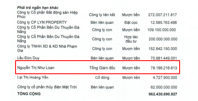 Tại báo cáo tài chính hợp nhất quý I/2024, Quốc Cường Gia Lai có khoản 78,2 tỷ đồng phải trả cho bà Nguyễn Thị Như Loan.