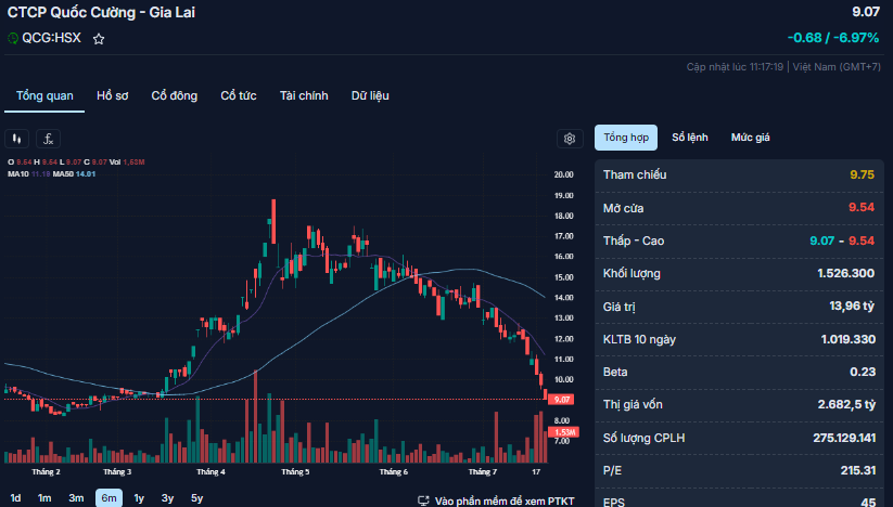 Tuy nhiên, đà lao dốc của cổ phiếu QCG được cho là bắt đầu từ khi Quốc Cường Gia Lai tổ chức bất thành cuộc họp ĐHĐCĐ năm nay diễn ra vào ngày 30/6. Nếu so sánh thị giá cổ phiếu QCG tại ngày 1/7 ở quanh mốc 12.900 đồng/cổ phiếu thì đến nay, cổ phiếu QCG đã giảm 33%, tương ứng vốn hóa "bốc hơi" 1.235 tỷ đồng.