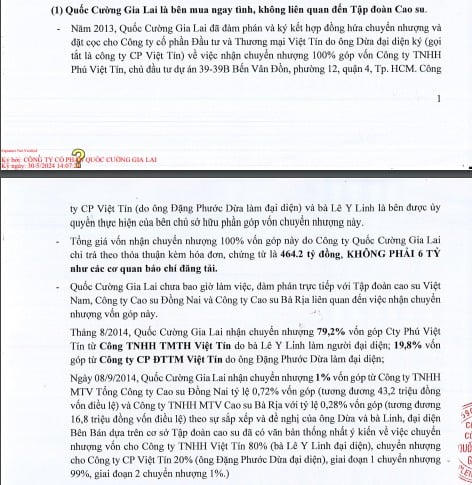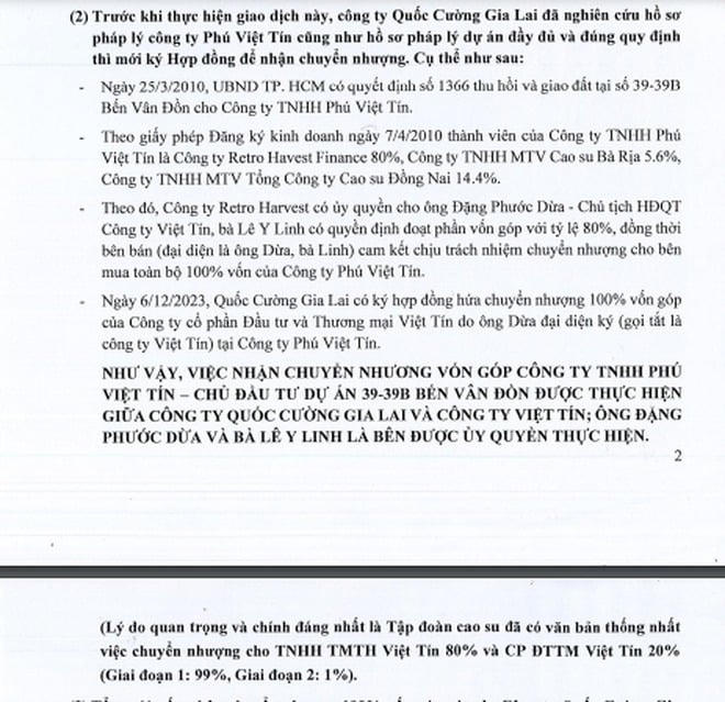 Theo Quốc Cường Gia Lai, năm 2013, họ đàm phán, đặt cọc cho Công ty cổ phần Đầu tư và Thương mại Việt Tín (do ông Đặng Phước Dừa đại diện) để nhận 100% vốn tại Phú Việt Tín - chủ đầu tư của dự án. Số tiền doanh nghiệp đã chi để nhận 100% phần vốn góp này là 464,2 tỷ đồng, không phải 6 tỷ đồng như một số đơn vị đăng tải thông tin. Đồng thời, Quốc Cường Gia Lai khẳng định chưa bao giờ làm việc, đàm phán trực tiếp với Tập đoàn Cao su Việt Nam, Công ty Cao su Đồng Nai và Cao su Bà Rịa về việc chuyển nhượng vốn góp này.