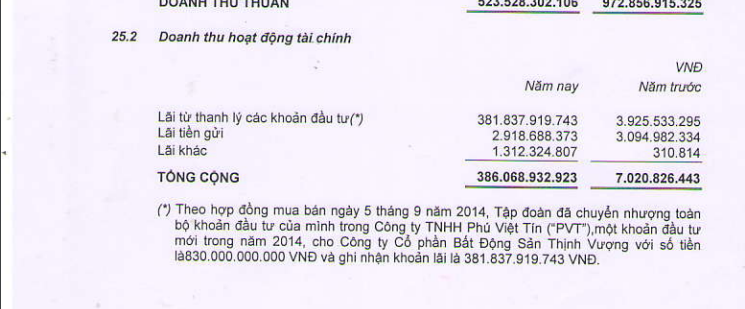 Tại thuyết minh chi tiết, theo hợp đồng mua bán ngày 5/9/2014, Quốc Cường Gia Lai đã chuyển nhượng toàn bộ khoản đầu tư của mình trong Phú Việt Tín - một khoản đầu tư mới trong năm 2014 cho CTCP Bất Động Sản Thịnh Vượng với số tiền 830 tỷ đồng và ghi nhận khoản lãi là 381,8 tỷ đồng.