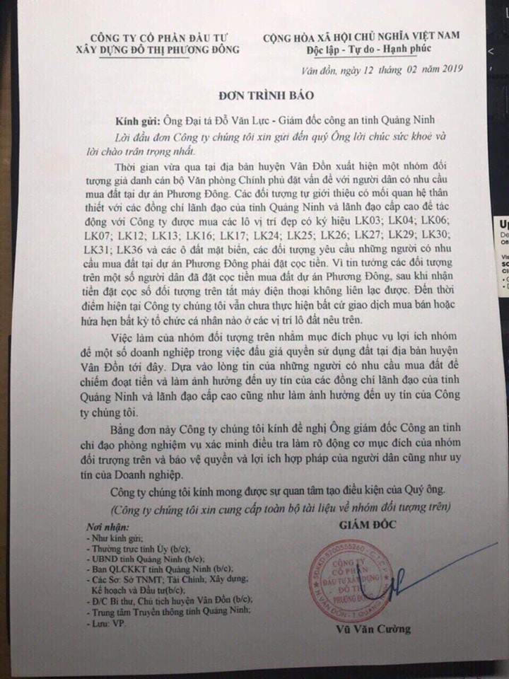 Cũng vào thời điểm này, dự án KĐT Phương Đông tiếp tục gây chú ý khi Công ty Phương Đông – chủ đầu tư dự án có đơn trình báo cơ quan chức năng địa phương về việc xuất hiện một nhóm đối tượng giả danh cán bộ Văn phòng Chính phủ, đến Vân Đồn lừa đảo người dân có nhu cầu mua đất tại Dự án Phương Đông để chiếm đoạt khoản tiền ứng trước.